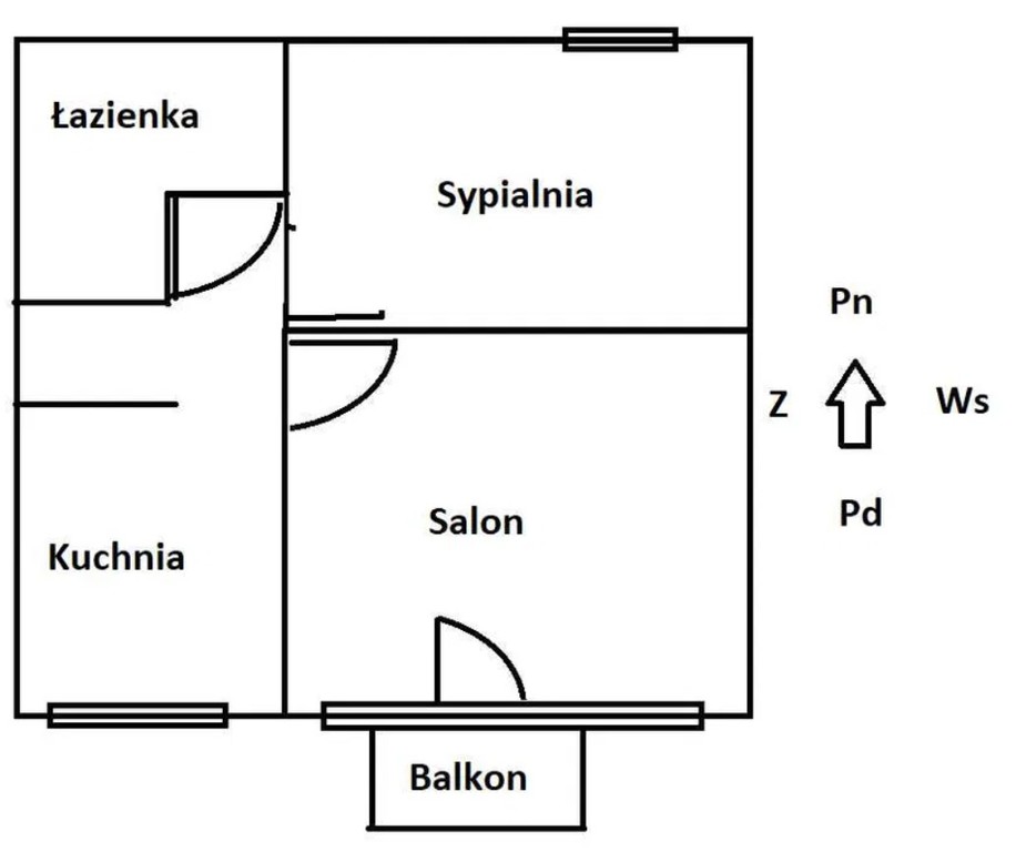 Układ mieszkania jest bardzo fajny. Z korytarza jest dostęp do każdego z pomieszczeń. Z salonu jest wyjście na mały balkon.
